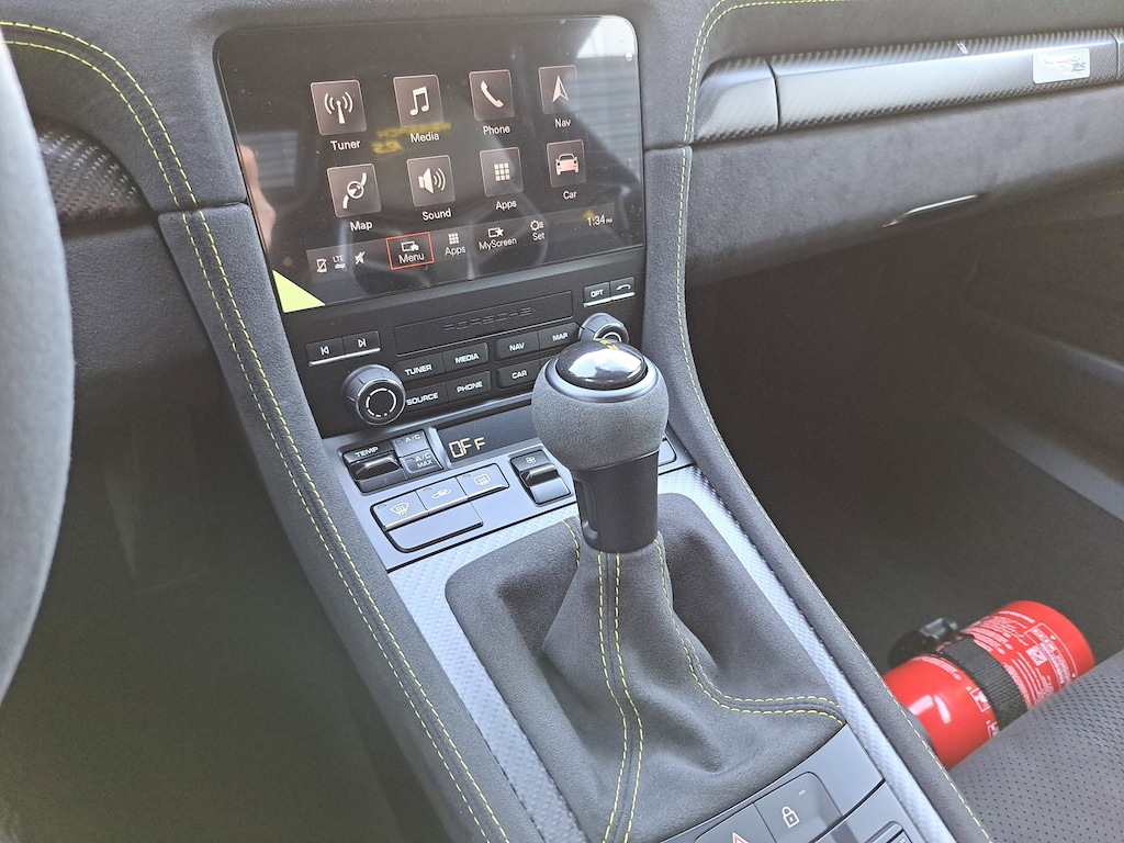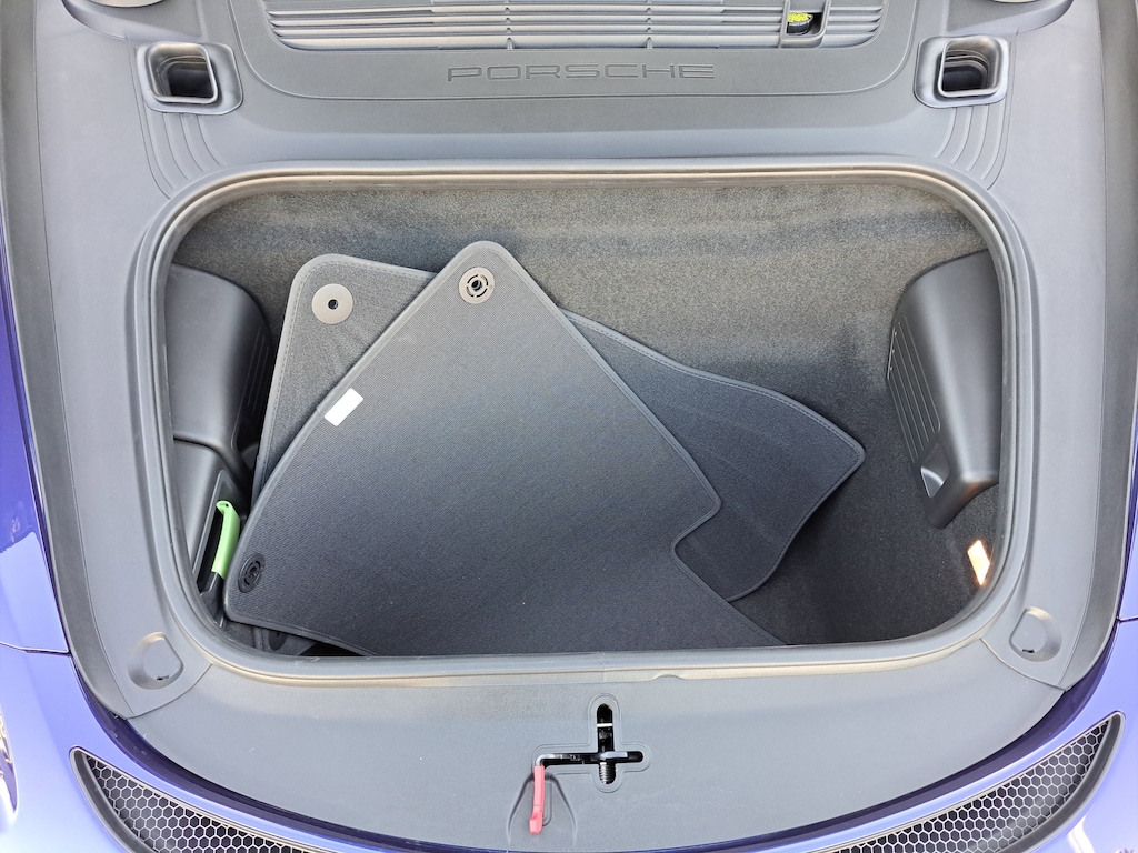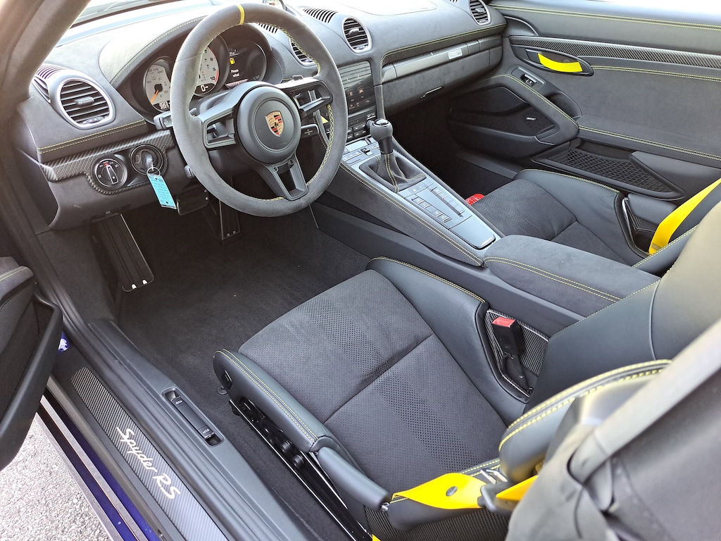 2024 Porsche 718 Spyder RS. Porsche Approved Certified Pre-Owned. 2,001 Miles. Gentian Blue Metallic Exterior. Leather/Race-Tex Interior in Black with Artic Grey Stitching. Weissach Package. Porsche Ceramic Composite Brakes (PCCB). Extended Deviated Stitching Interior Package. Front Axle Lift System. Chrono Package. BOSE Surround Sound System. LED Headlights incl. Porsche Dynamic Light System (PDLS). Accent Package Logos - Yellow. Wheels Painted in Satin Black with Outer Lip in Racing Yellow. Seat Belts in Racing Yellow. Instrument Dials in White. Chrono Stopwatch Dial in White. Door Pull Loops in Racing Yellow. Door-Sill Guards in Carbon Fiber, Illuminated. Storage Compartment Lid in Race-Tex with Porsche Crest. Fire Extinguisher. Front Trunk Lid in Exposed Carbon Fiber/Partially Painted.